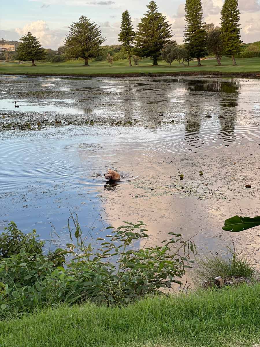 He still can’t resist it when ducks waggle their bottoms at him, even when the golf pond is the brownest and stinkiest I have ever seen it: