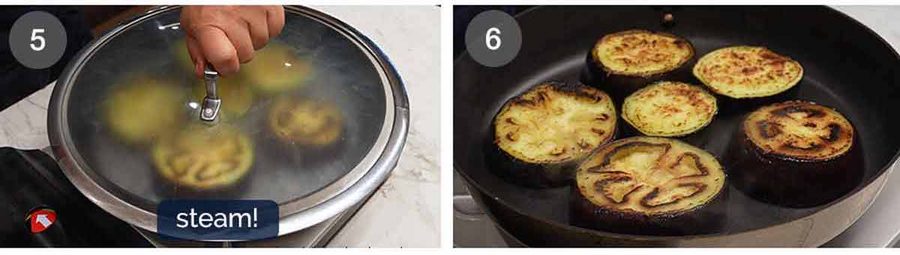 Pan-steam – Quickly put the lid on to trap the steam to cook the eggplant. Leave it for 2 minutes or until the water has evaporated.