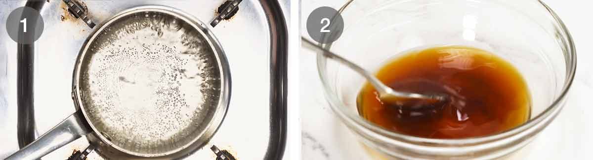 Simmer the mirin and sake for 1 minute in a tiny saucepan.