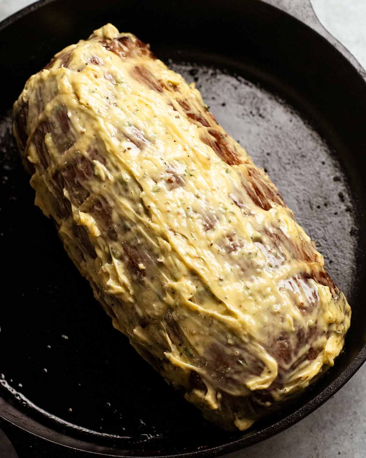 Slather 3/4 of the butter onto the beef – top and sides (not underside). Using softened rather than melted butter does wonders to make the garlic stick to the surface of the beef!