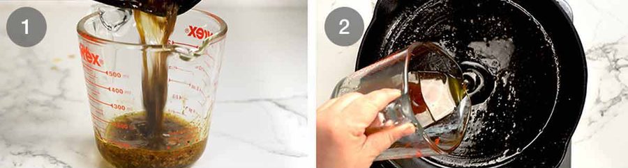 - Roasting juices – Pour all juices in skillet into a bowl or jug. The fat will rise to the surface. Pour off 1/4 cup (60ml) of the fat back into the skillet (reserve the rest for later).
