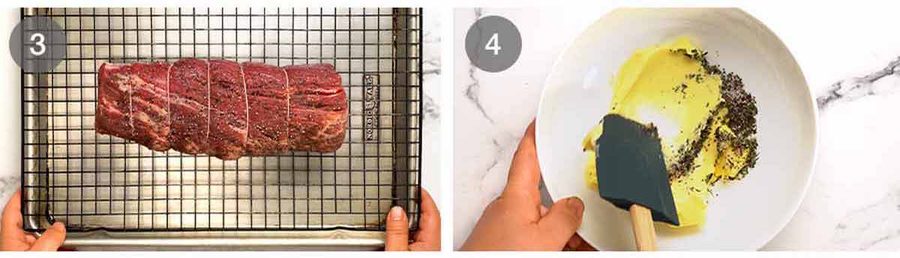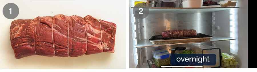 - Prep beef – Pat beef dry with paper towels, sprinkle with salt and pepper all over. Place the beef on a rack on a tray then refrigerate uncovered 12 to 24 hours. (Can skip, Note 5)