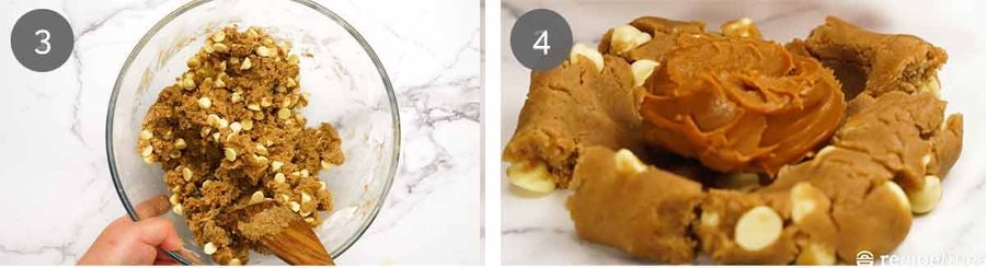- Stuff – Measure out 8 x 125g portions of dough (4.4 oz/ heaped 1/3 cup), press dough together into a rough ball. Flatten, top with frozen Biscoff, enclose and shape into a ball with a flat base (ie tall dome), sealing cracks to avoid Biscoff leakage. Alternative: Break each into 2 balls, flatten both, sandwich Biscoff in between then fold up sides to enclose. You'll figure out the best method!