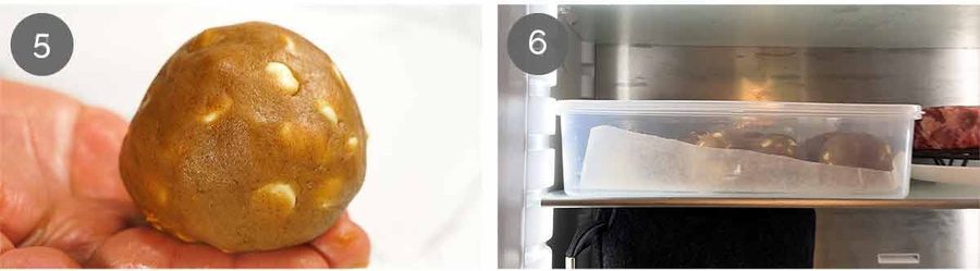 Stuff and roll the cookie balls. After the 12 hours fridge time, freeze for 3 months. However you store it, make sure it is very airtight so the surface of the cookie balls do not dry out. I use ziplock bags and remove as much air as possible. If using containers, I wrap in cling wrap first then put in the container.
