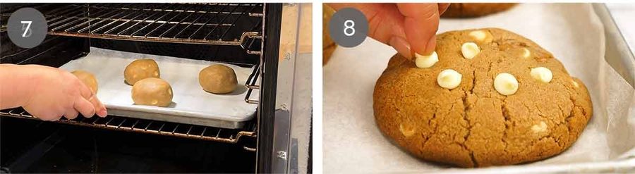 Then cool for 20 minutes on the tray. The edges and base will crisp up, the cookie will finish cooking inside and the surface becomes more golden too. But don’t worry, they will still be warm and gooey inside!