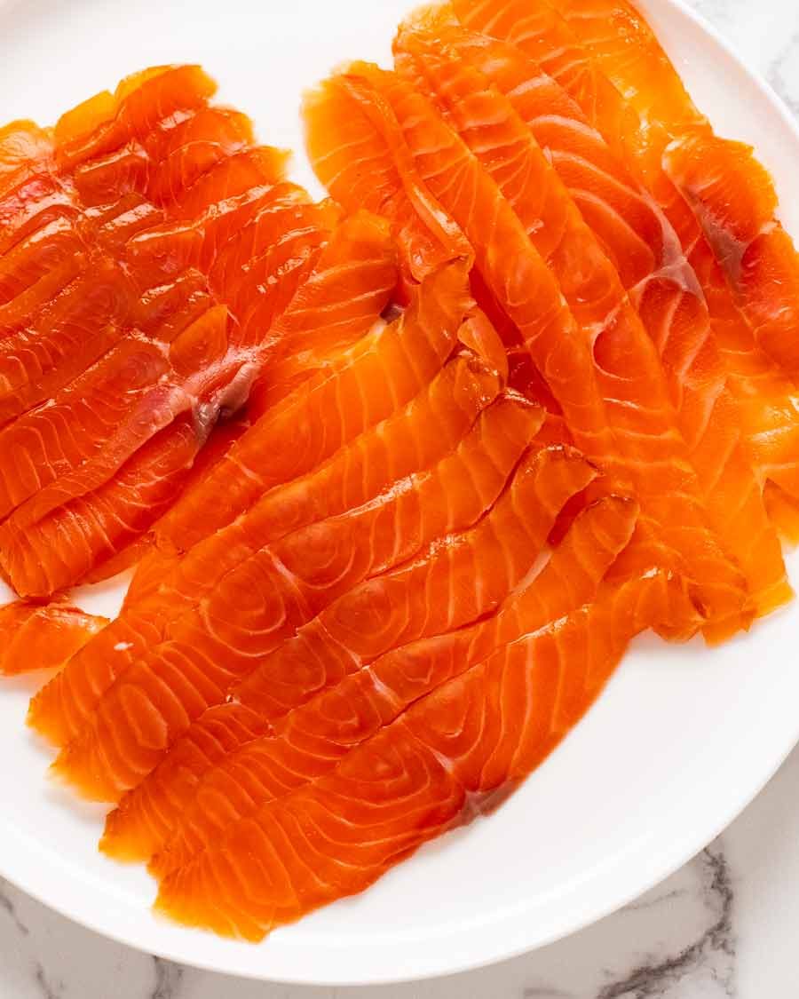 Homemade beetroot cured salmon or salmon gravlax would also be ideal! They taste different to smoked salmon because they are not smoked. And they have fresher flavours from the respective flavourings used. But they have the same texture as smoked salmon – and are cheaper to make too, with fresh flavour you cannot buy!