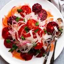 - Assembling: Place 1/2 orange rounds on plate. Pile over 2/3 the fennel, litter with onion, parsley, place half remaining orange slices on top. Top with remaining fennel, oranges then onion. Sprinkle with parsley leaves. Just before serving, drizzle over the Blood Orange Dressing, mainly on the oranges so it doesn’t stain the fennel too much. Serve immediately!