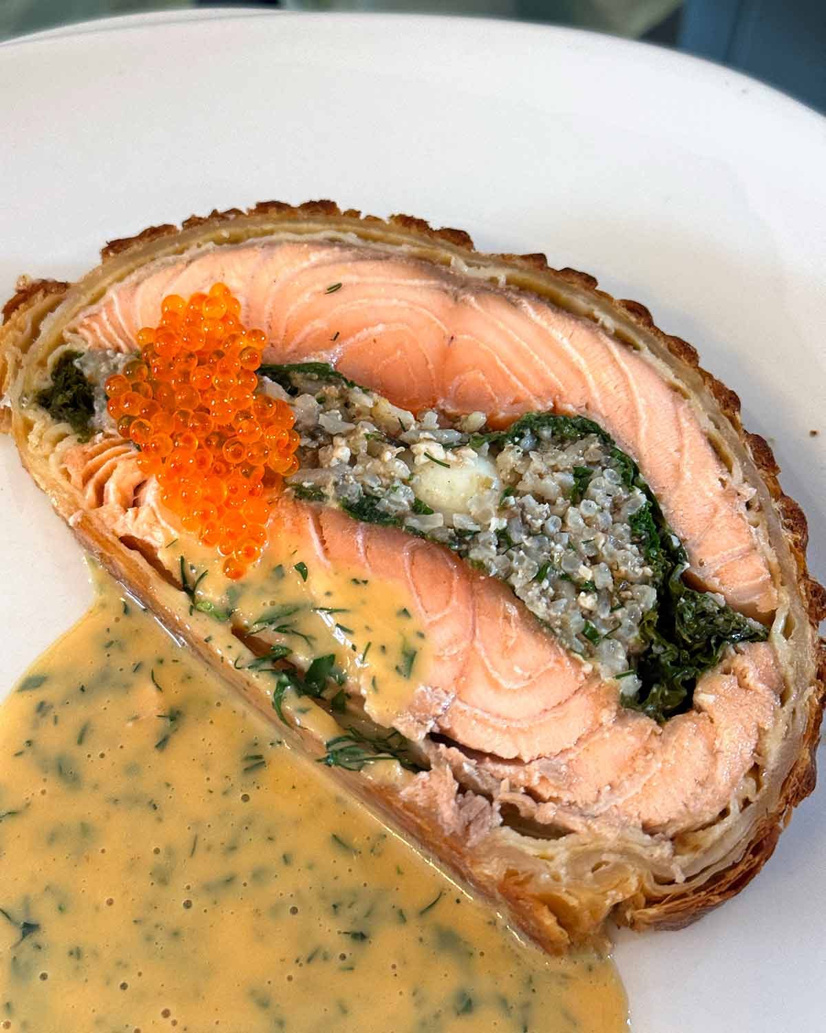 Sorry, back to positive notes! There was a spectacular main dish, Salmon Coulibiac – a puff pastry enclosed salmon stuffed with rice and quail eggs that is a special occasion French classic. Think – salmon version of Beef Wellington.