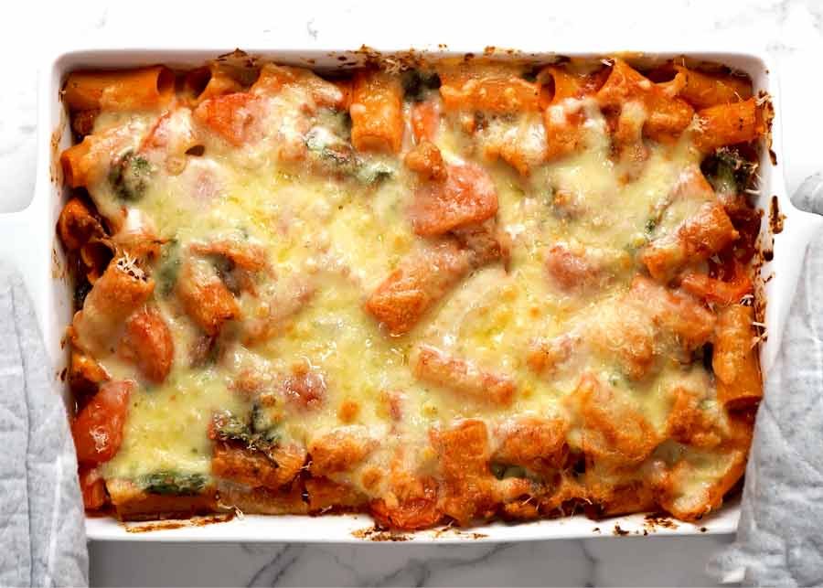 Nope. Not in my world. Pasta bakes should be saucy and juicy, molten and oozy! Generously loaded with add-ins, if you’re going for a dinner pasta bake (as opposed to a side dish like Mac and Cheese).