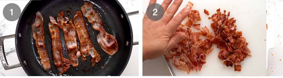 - Crisp bacon – Put bacon in an unheated very large non-stick pan (Note 2). Turn stove on medium high. The fat will melt so the bacon cooks in its own fat. Cook until light golden, remove onto paper towels, leaving fat in the pan. Once cool, cut into 1cm / 1/3" pieces.