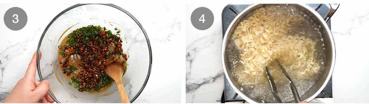 Sauce base – Mix the sesame paste, soy, vinegar, sugar, salt and sesame oil until smooth. Use a bowl large enough to toss the noodles because we will be adding the noodles into the sauce. Sprinkle the green onion on top – don’t mix it in. We will be pouring hot oil on it so it partially cooks it.