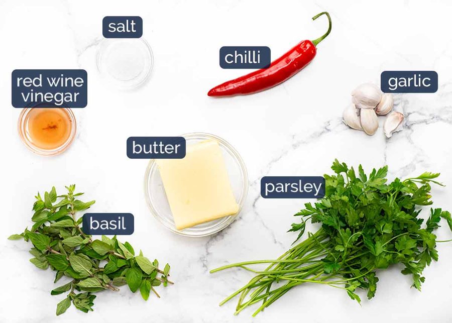 Here’s what you need to make it. The same ingredients as Chimichurri Sauce, just switching butter for the olive oil, and ratios balanced to suit using butter rather than oil.