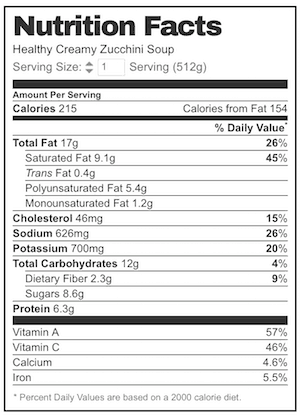 You don’t need loads of cream to make a Creamy Zucchini Soup because the natural texture of cooked zucchini blends into a thick, silky soup. This is a bowl of goodness to warm your soul, it’s ultra tasty and yet only 220 calories for a big bowl, or 98 calories if you skip the cream!