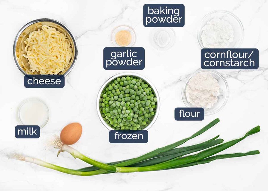 Frozen peas – Just regular frozen peas or baby peas, it works fine for both. No need to thaw or pre-cook. Frozen peas are cooked before being frozen so there’s no need to cook it beforehand, they just need to be heated which happens in the time the fritter takes to cook on the stove (3 – 4 minutes).