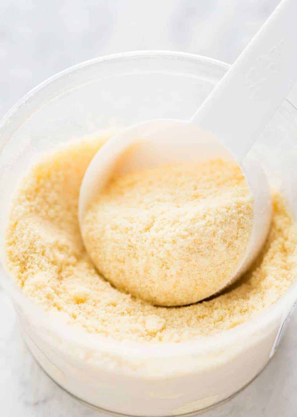 This is the “sandy” parmesan I use for this recipe. It’s made with real parmesan, grated finely, and it’s sold in the refrigerator section.