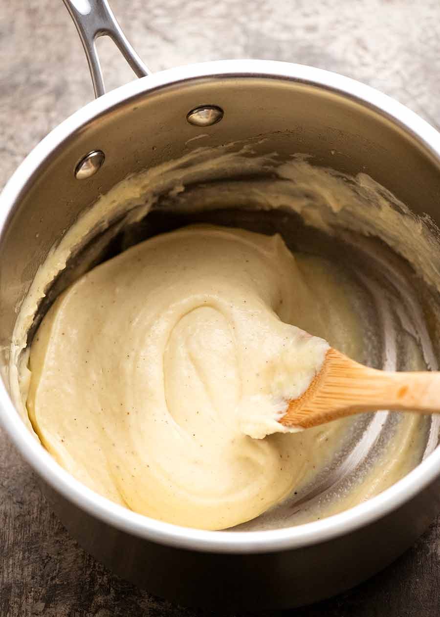 Heat the milk and cream in a saucepan, just until hot. This makes it incorporate much easier and more smoothly into the flour/butter mixture which is especially key in this Béchamel Sauce because it’s so thick;