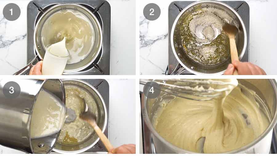 Thicken – Cook, stirring constantly, until the mixture is so thick that you can spread it like peanut butter on bread. This will only take a minute or so because the ratio of flour to milk in this Béchamel is higher than normal so it’s spreadable rather than pourable.
