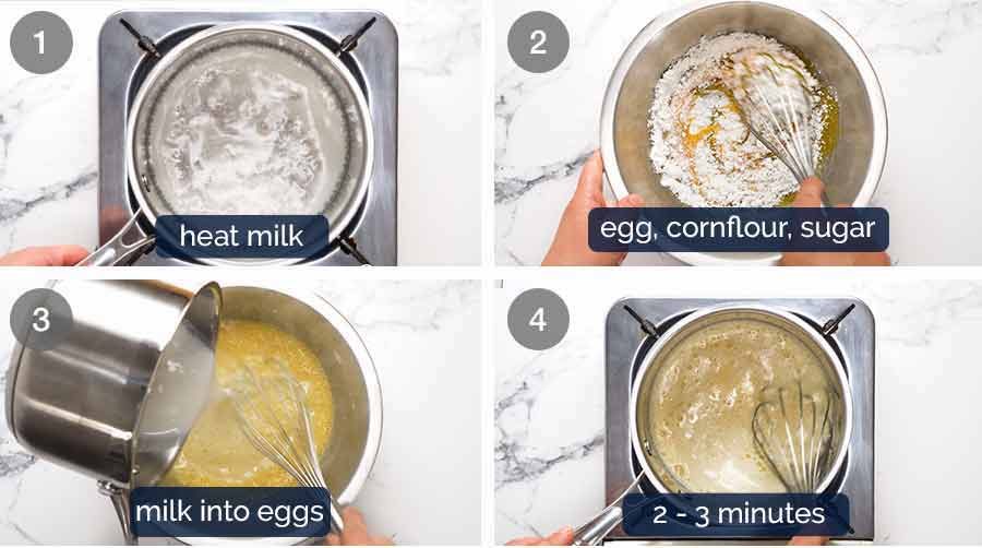 - Whisk egg: Whisk yolks with remaining sugar, then whisk in the cornflour.