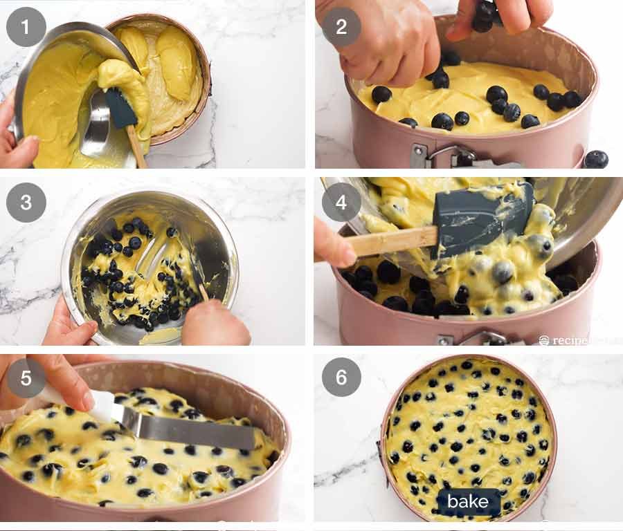- Bake 45 minutes: Place the cake in the oven and bake for 35 minutes. Remove, then use 2 small paring knives to burst some of the blueberries on the surface (1 knife to stop blueberry spinning, the other to burst). Limit bursting time to 1 minute, no longer! Then bake for a further 10 minutes.