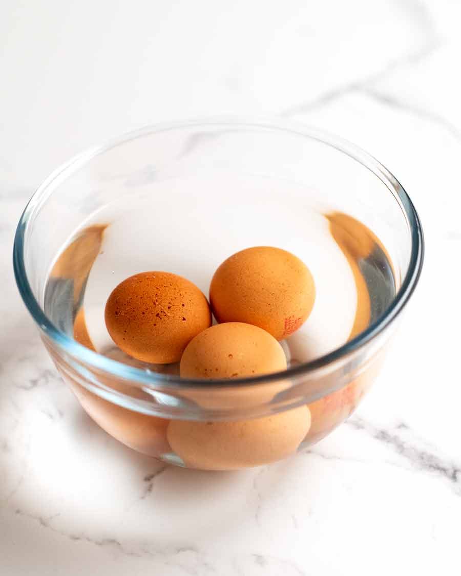 Place eggs in a bowl and fill with warm tap water so the water level is 10cm / 4″ above the eggs. Leave for 10 to 15 minutes until the eggs do not have the fridge chill.