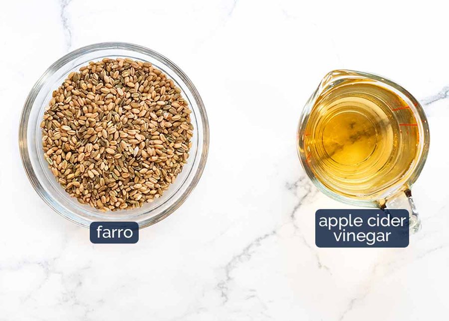 - Cook farro (Note 1) – Put the toasted farro in a saucepan with the vinegar, water and salt. Bring to a boil over high heat then reduce to medium so it is simmering. Cover with lid then simmer for 40 – 45 minutes or until all/most of the liquid is absorbed and the farro is ready. It should still have a bite to it (not soft like pasta) but not a hard centre. Add more water if needed, and keep cooking – don't be afraid to cook it softer if you want. Drain off excess liquid, if there is any, then transfer to a large bowl. (Taste: a bit tangy, the "vinegar" component used in salad dressings!)