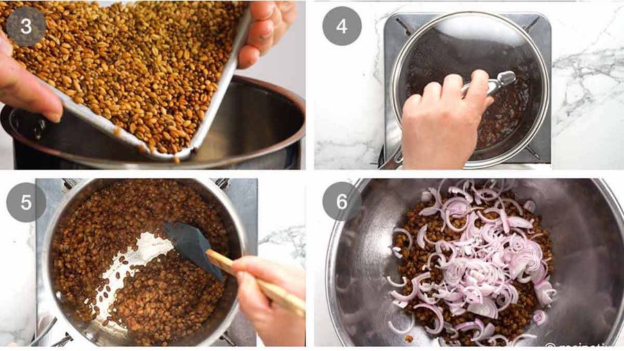 Immediately pour the sizzling oil over the eschallots on the farro. The hot oil will partially cook the eschallots and make them wilt a bit.