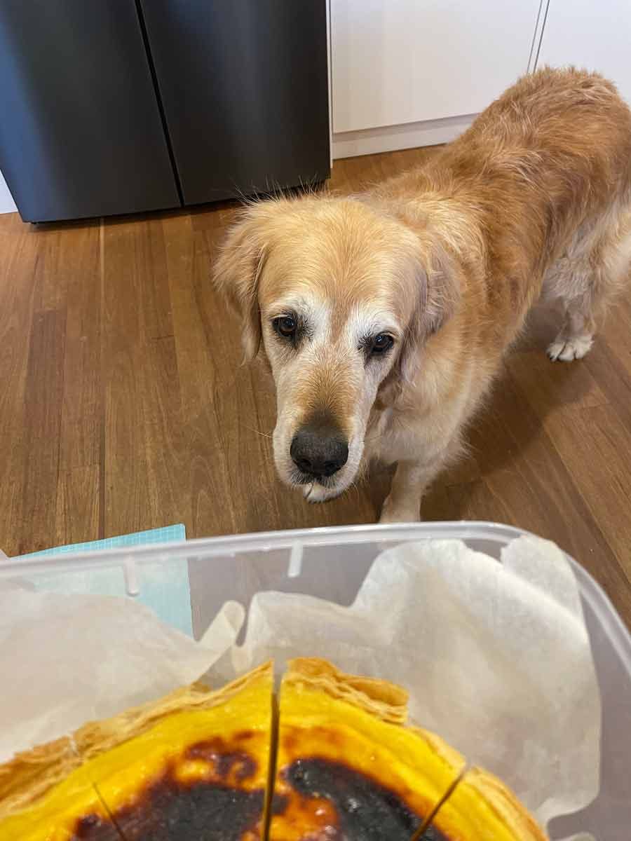 Yes, Dozer. This entire Flan Pâtissier is for you, not for the builders at our home. I’m going to put it down on the ground and you can devour the whole thing, all by yourself. (Dream on Dozer. Dream on.)
