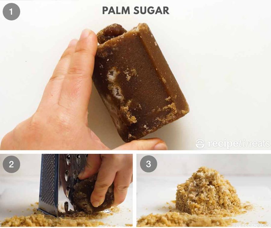 Palm sugar comes in discs or in blocks, such as the cylindrical one pictured above. To ensure it dissolves easily into the dressing, it needs to be grated. I just use a standard box grater.
