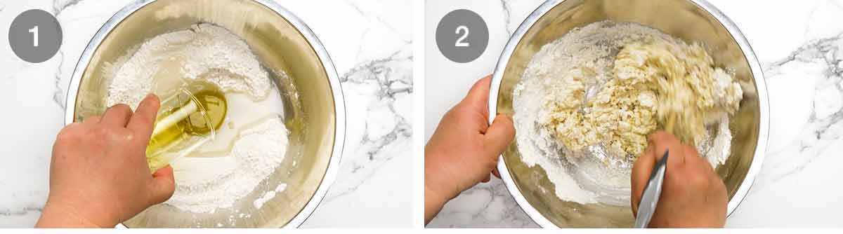 Make dough – Mix the dry ingredients (flour, sesame seeds and salt) using a rubber spatula (or wooden spoon). Make a well in the centre then add the water and oil.
