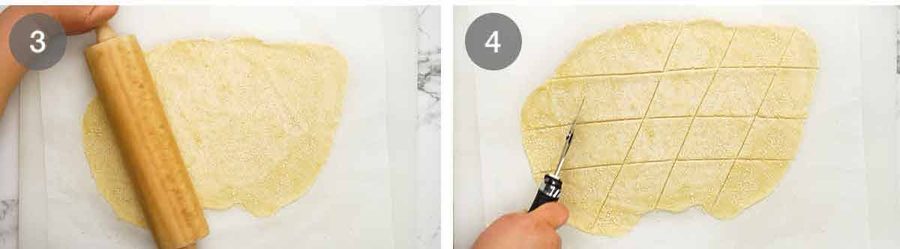 This is a very simple dough to make that doesn’t involve yeast, kneading or rising. It’s also a friendly dough to work with, easy to roll out thinly (so the crackers bake up nice and crisp) and pick it up without tearing.