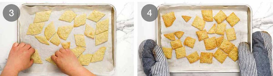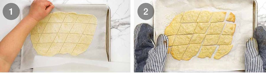 – I tried baking the sheet whole and also two large sheets, like the large (expensive!) cracker sheets you see at gourmet stores. But found that the edges got a little too golden before the middle became crisp.* If using a knife, cut straight up and down, rather than dragging the knife through the dough which will make the edges untidy.