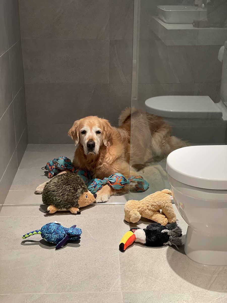 Office bathroom. Now doubles as Dozer’s playroom. Staff who walked into this had a good laugh!!