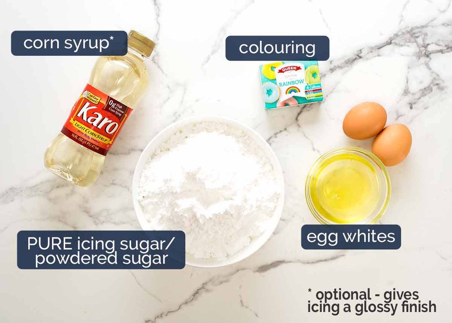 PURE icing sugar / powdered sugar – fellow Aussies, be sure to use PURE icing sugar, not soft icing sugar. Pure icing sugar is just icing sugar, whereas soft icing sugar has cornflour added to prevent it from clumping which may prevent the royal icing from setting hard.