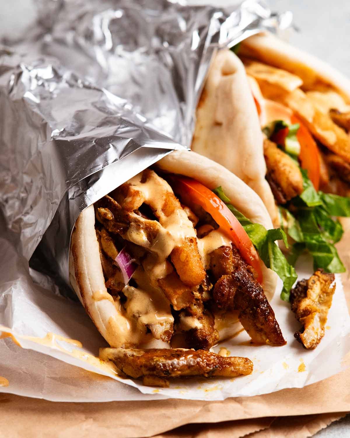 Assemble gyros – To assemble, smear sauce down the middle. Pile chicken on, then place lettuce and tomato down the side. Sprinkle with red onion, top with chips, drizzle with more sauce then fold and devour!