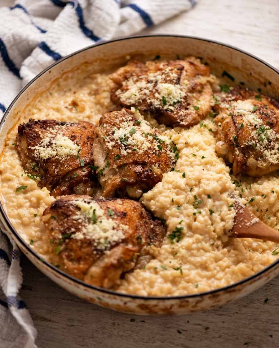 One Pot Chicken and Risotto – An attempt at a “dump and bake” no stir risotto. No good – unevenly cooked risotto under the chicken. Think it needs to start on the stove, like this recipe.