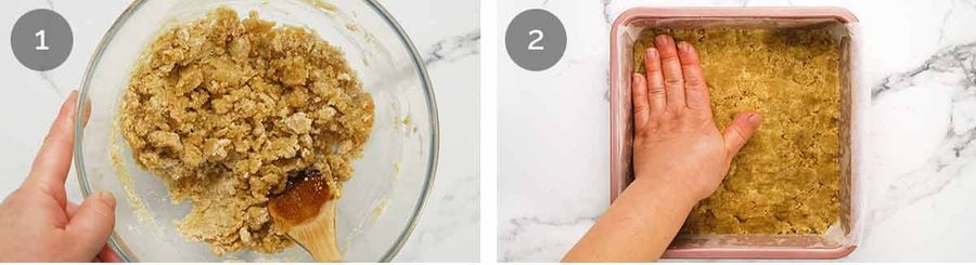 Bake 20 minutes – Press into a 20cm/8″ square lined pan. I crumble it across the base and press with my hands. It doesn’t need to be perfectly flat, you just want to make sure there are no cracks the filling can through, but sometimes I deploy the assistance of a spatula to press down evenly.