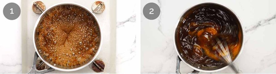 Melt the butter in a small saucepan then add the sugar, maple and salt. Bring it to a simmer then take it off the heat.