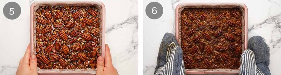 - Fill and bake – Pour the pecan filling onto the base and spread out evenly. Top with the Decorating Pecans. Bake 25 minutes.
