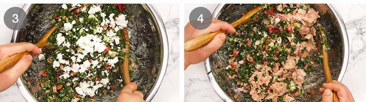 Tuna chunks – Then add the tuna. Break it up gently into chunks as you gently toss it through. I personally like having chunks rather than tiny crumbly bits of tuna which is why I add the tuna last.