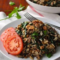 Even with that much silverbeet, my Middle Eastern Lamb and Lentil Rice Pilaf itself only has a Nutrition Grade rating of “B” (I ran it through a Nutritional Analysis). The challenge I find with coming up with fresh ideas for one pot meals is making sure that they are a complete meal. To me, a complete meal is one with a Nutrition Grade rating of A. So if you serve this with a few juicy slices of tomato (just plain, no dressing), it brings it up to A. This pilaf is so aromatic that plain slices of tomato are the perfect accompaniment to bring a burst of freshness to this meal.