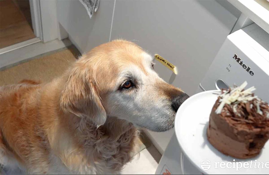 In today’s recipe video, you get to watch Dozer following me around the house while I eat the chocolate cake then eventually trapping me in a dead end (laundry). No chocolate cake for Dozer!!