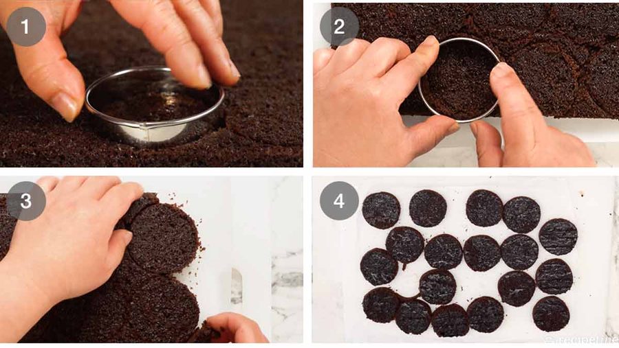 Use a 6cm / 2.4″ round cutter to cut circles out of the cake. Cut the circles as close to each other as you can to minimise wastage. You should have 21 circles. Feel free to use a different size cutter to make more smaller ones, or less larger ones!