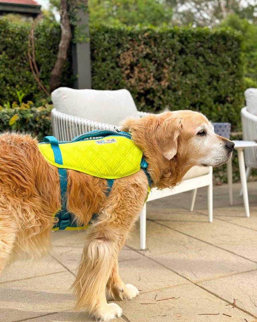 Looking at it (below), it looks too small and doesn’t look like it will provide enough flotation support. I think it’s safer to stick with a bulkier, senior-citizen friendly version with extra flotation support to keep him nice and buoyant in the water. Safe to say Dozer’s high performance sports days are over!!