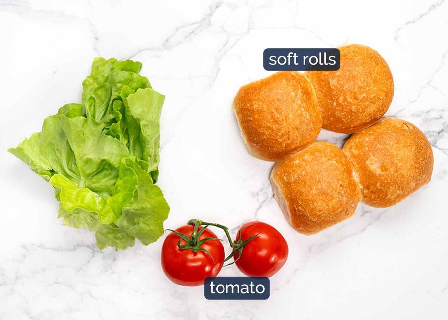 And lastly, to complete our Peri Peri Burgers, we just need some soft white rolls, lettuce and tomato. Any lettuce you have / can get is fine here. I use butter lettuce (the lovely soft kind). Rocket and baby spinach will be great too, though I’d probably avoid using chicory or other bitter lettuce varieties. If using cos (romaine) or iceberg lettuce, consider shredding it.