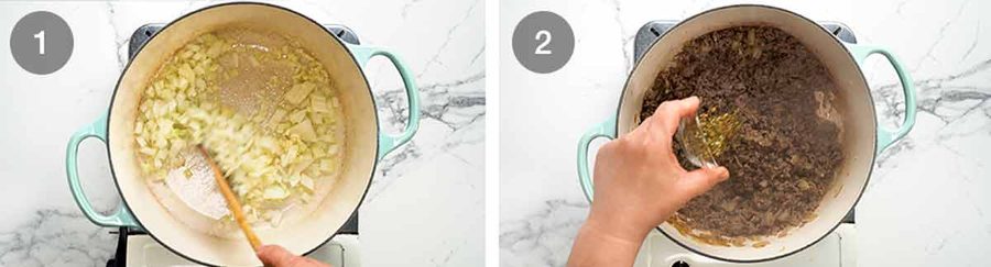 Cook beef – Sauté the garlic and onion. Then add the beef and cook, breaking it up as you go, until you no longer see red.