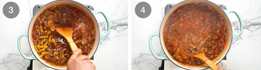 Add liquids and pasta – Add the stock, canned tomato, red pepper flakes, salt and pepper. Give it a good stir, then add the pasta.