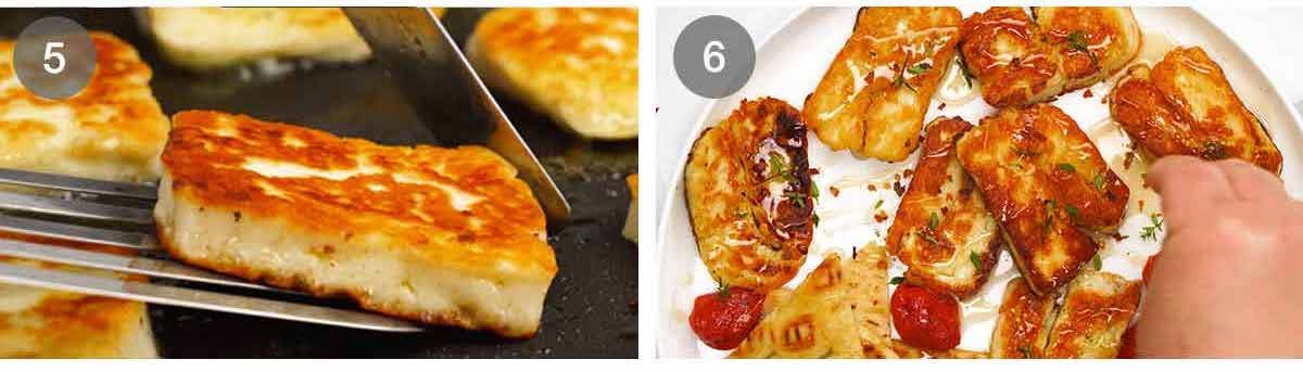 - Serve immediately, quick, before the halloumi goes squeaky! 🙂 Though actually, the squeak doesn’t bother me but it's at its prime straight out of the pan when the surface is still crisp and the inside is soft. (Note: Honey on the plate is ideal for bread mopping)