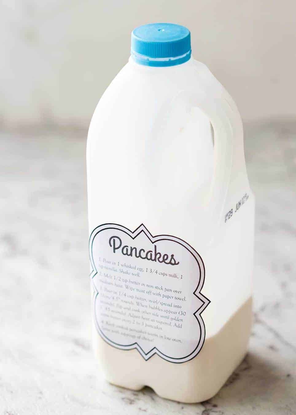 Just measure out the dry ingredients and pop them in a ziplock bag, jar or airtight container, then when you want to make fresh pancakes, just add the wet ingredients!