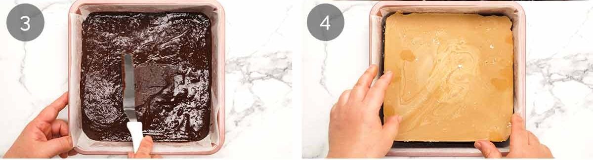 So, I reverted back to my usual freezing method and it worked perfectly. And so easy. Yes, you have to wait for the peanut butter to freeze. But once that’s done, just place the frozen peanut butter slab on a layer of brownie then cover with more brownie.
