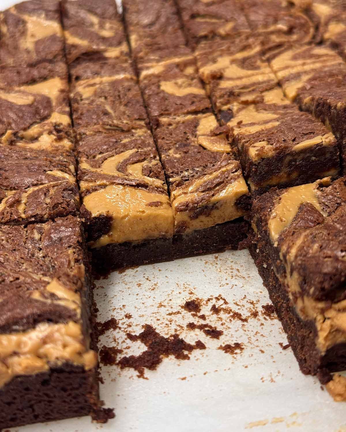 - Save 2 tbsp peanut butter for swirling, warm to loosen then freeze rest in lined pan. Melt butter and chocolate, mix in sugar, then eggs + vanilla, then flour + cocoa + salt. Pour half in pan, top with peanut butter slab, cover with remaining batter, swirl through warmed reserved peanut butter. Bake 32 min at 180°C/350°F (160°C fan). Cool 1 hr on counter, 3 hrs+ in fridge, cut.